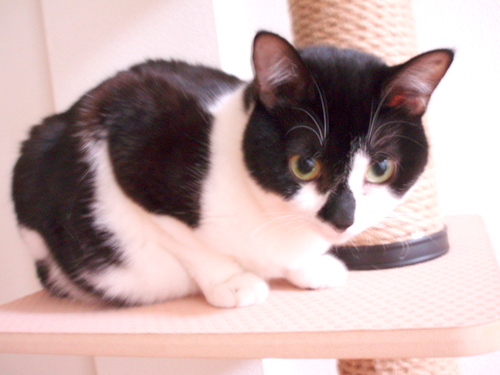 Y家にすっかり馴染み、猫タワーの一番上にまるちゃん、真ん中の箱の中にミィちゃんが入っていました。