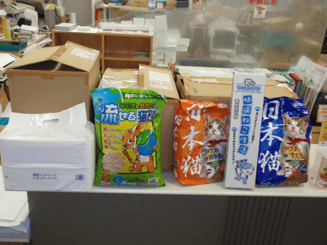 それと、組合事務所にフ-ド(沢山!)・猫砂・オシッコシ-ツ・爪研ぎを送って頂いてるのを見ました。