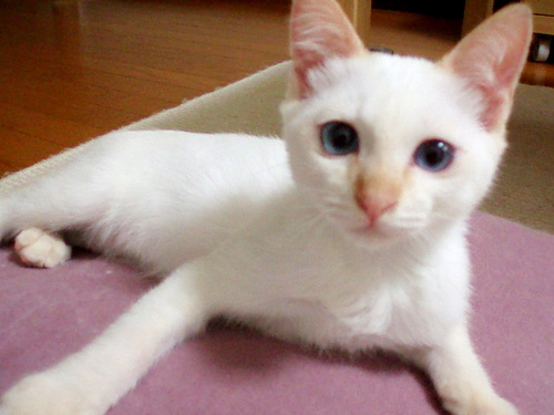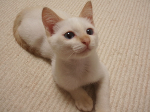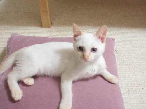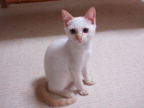 特徴:全体はクリーム色 耳がキャメル、尾は真っ直ぐで虎柄 瞳が美しいブルー